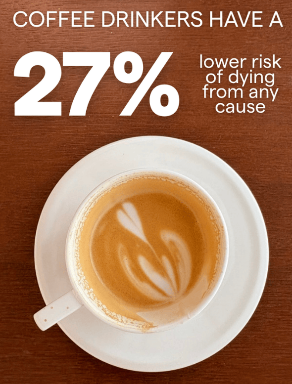 Research now consistently shows that coffee drinkers live longer than non-coffee drinkers - around a 27% lower risk of dying from any cause. Emerging research is showing that compounds in coffee slow biological ageing at a cellular level.